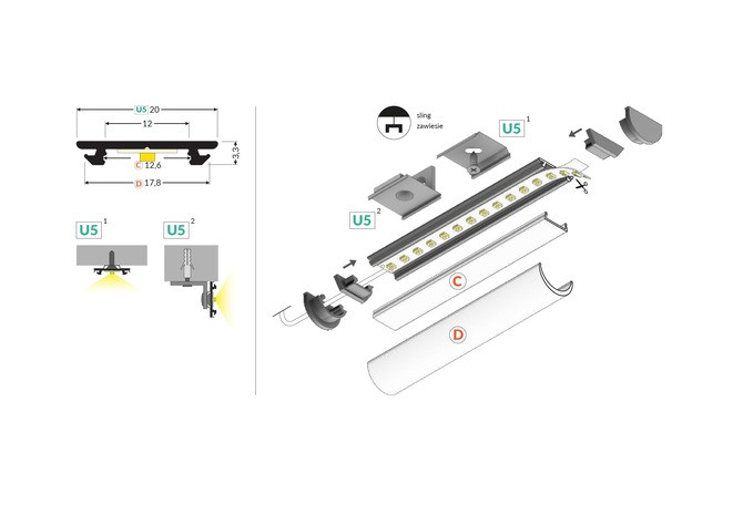 Az ARC12 LED profil lehetőséget ad a mostanában trendi függeszték LED lámpa kialakítására is. Saját elképzelése szerint választhatja meg a LED szalag fényerejét, színhőmérsékletét és a lámpa ívelését.