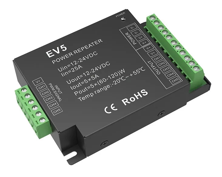 RGB/CCT (színváltós+szabályozható színhőmérsékletű fehér) LED szalag világításokhoz ajánlott 5 csatornás jelerősítő.