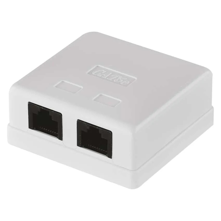 RJ45 UTP-adatátviteli aljzat két csatlakozóval. Az aljzat alsó kimenettel rendelkezik, és elsődlegesen falra szerelt használatra tervezték. Az UTP-aljzat méretei: 26 × 62 × 60 mm.